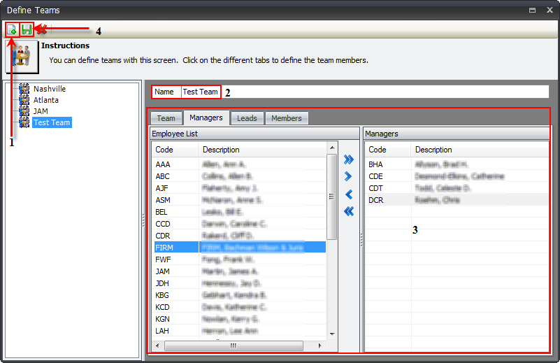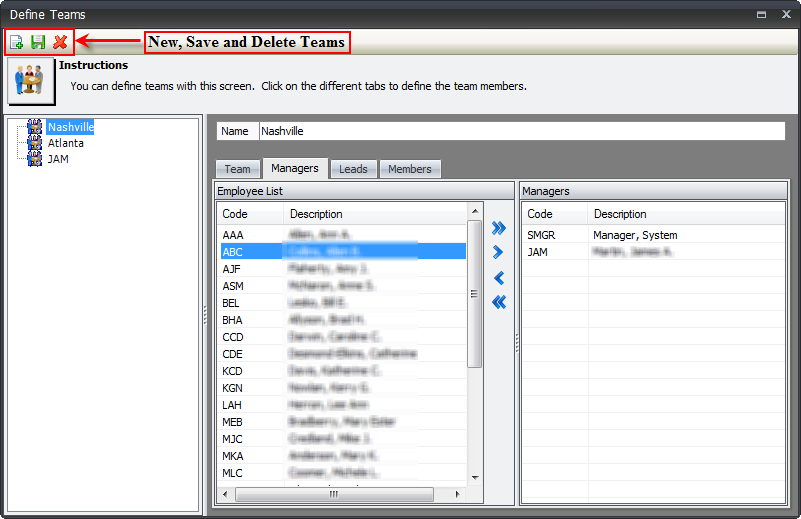 - Select the appropriate team members for Managers, Leads and Members. You can do this by double clicking on the name in the Employee List, or by highlighting the name, and using the blue arrows to move them. You can move all and remove all with the double blue arrows.