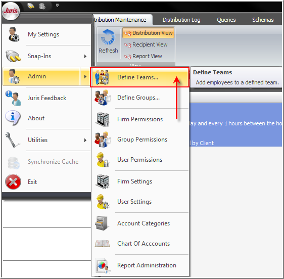 - Select the Define Teams function from the Juris menu item.