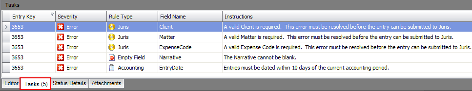 Tasks are notifications of issues that should be addressed regarding a submission. Tasks reside in both My Expenses and My Time. Depending on your rule set, Tasks are presented with severity, rule type, field name and instructions on how to reconcile the task.