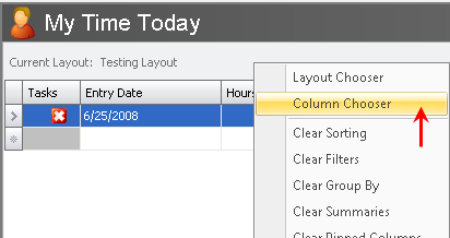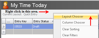 - In the My Time or My Expense function, right click in the layout header area, and select Layout Chooser.