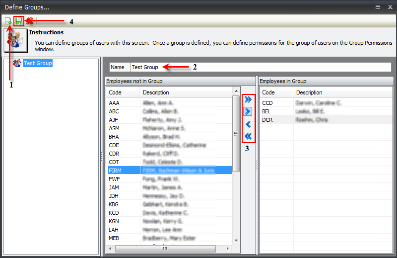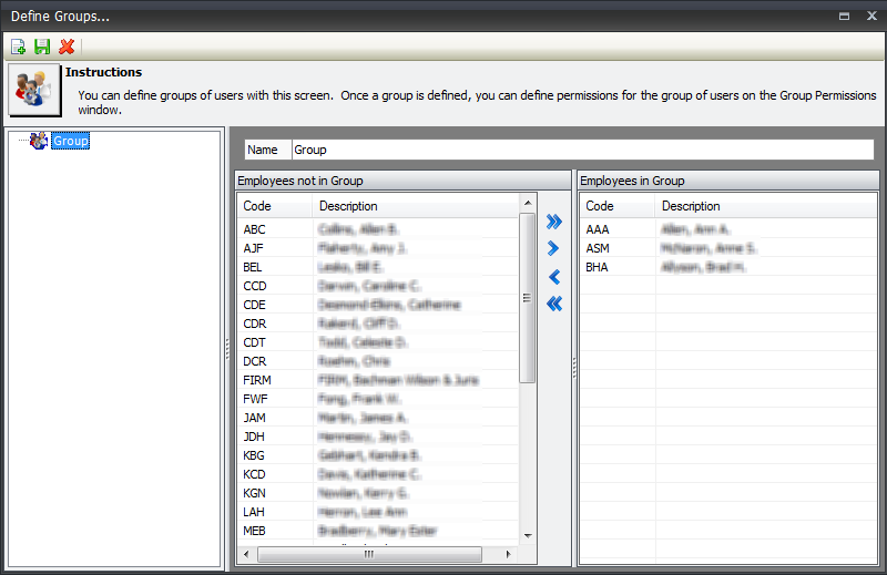 - Select the appropriate Employees to be in the group. You can do this by double clicking on the name in the Employee List, or by highlighting the name, and using the blue arrows to move them. You can move all and remove all with the double blue arrows.