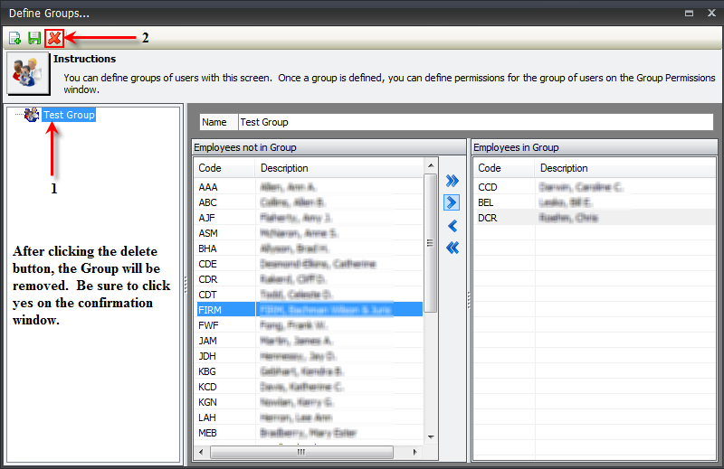 - Click the Delete button marked by the red "X". Click the Yes button to confirm the deletion. The group will be automatically removed from the team pane.