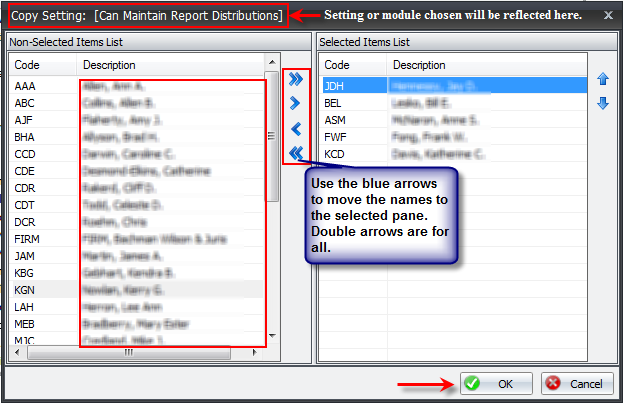 Select the users that will receive the copied settings or modules from the user window. You can use the blue arrows to move/remove the user selections. The double blue arrows are to move all users back and forth for selection.