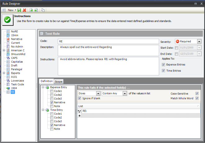- On the Definition tab, select the fields where the rule should be applied. You can expand Time Entry and Expense Entry to see the available fields. In this example we will place check marks beside the field Narrative under both Time Entry and Expense Entry.